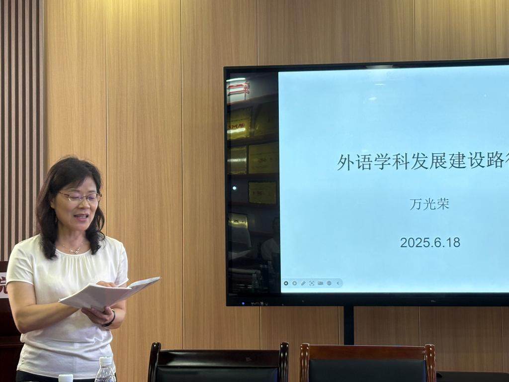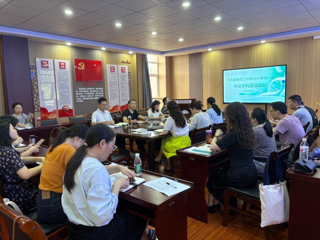 6月18日,天天干天天日举行2025万光荣教授工作坊第一期活动。我院特聘教授万光荣教授亲临指导。本期工作坊活动为期一天,主题是推进学院科研工作,共谋外语学科发展。活动目标是建言献策,凝聚共识,探讨外语学科发展方向,推进“人手一个本子”活动,提升教师科研写作能力;加强师资队伍建设,指导我院教师考博等。我院万光荣教授团队成员、学院高层次人才、其他感兴趣的教师参加了上午的外语学科发展专题讨论,下午的主题学术报告的两场活动。活动由院长刘诺亚主持。