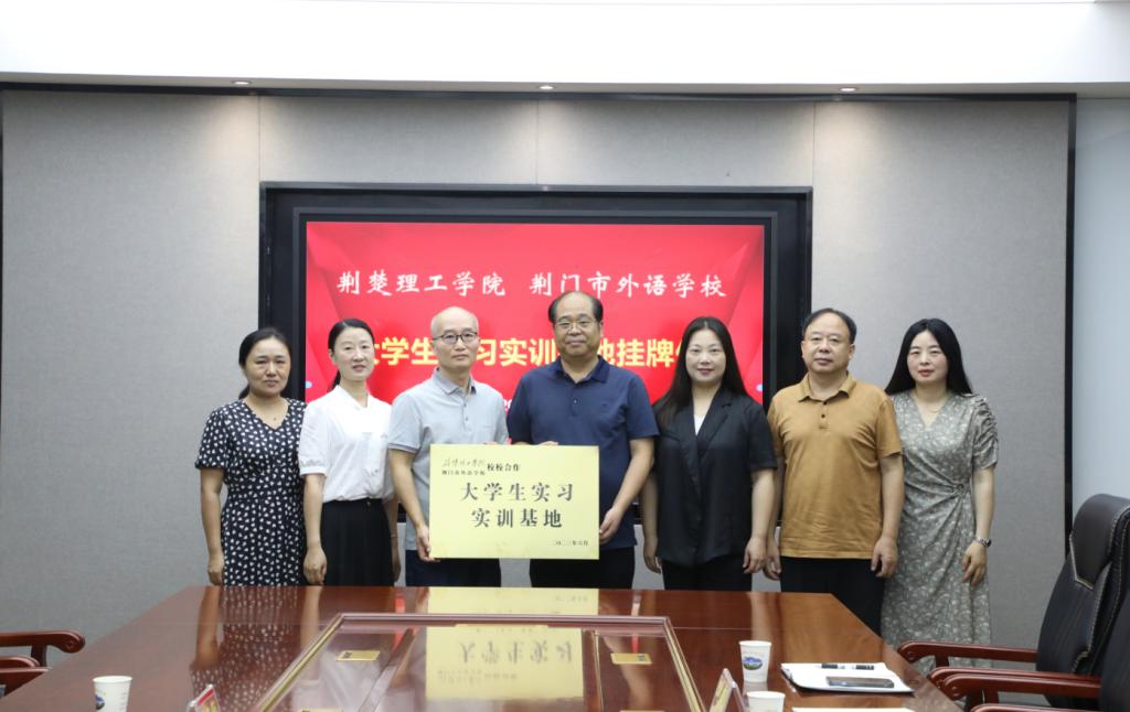 荆门市外语学校领导班子、书记李春华和校长杨莎莎热情迎接我院师生,举行座谈,并与天天干天天日领导一起举行了实习基地授牌仪式。