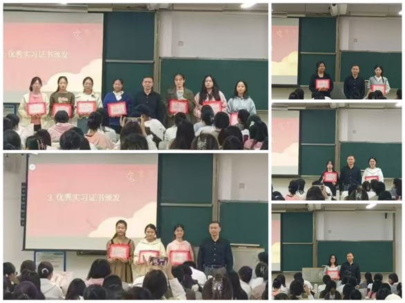 会议第三项议程,院长刘诺亚为在实习实训中表现优秀的16名同学颁发优秀实习生证书。