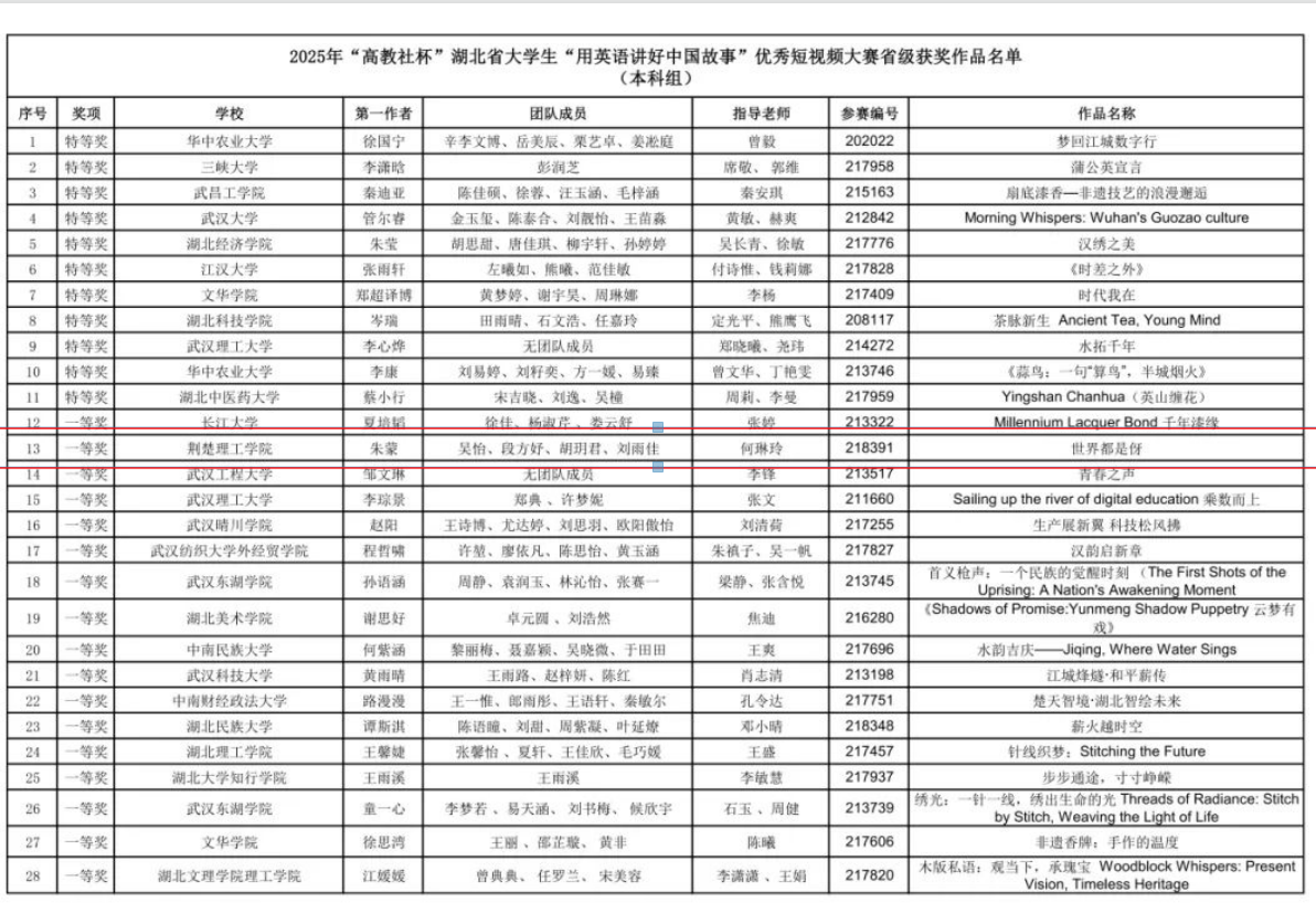 由中共湖北省委外事工作委员会办公室指导、湖北省翻译工作者协会主办、高等教育出版社协办的2025年“高教社杯”湖北省大学生“用英语讲好中国故事”优秀短视频大赛的省赛评审工作已落下帷幕。我院何琳玲老师代表荆楚理工学院指导学生团队参加2025年“高教社杯”湖北省大学生“用英语讲好中国故事”优秀短视频大赛,获得省级一等奖(本科组)。